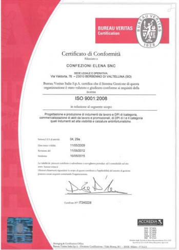 Confezioni Elena s.n.c. ha ottenuto il certificato di conformità ISO 9001:2008 numero IT240228 per la progettazione e produzione di indumenti da lavoro e DPI di I categoria, commercializzazione di abiti da lavoro e promozionali, di DPI di I e II categoria quali indumenti ad alta visibilità e calzature antinfortunistiche.